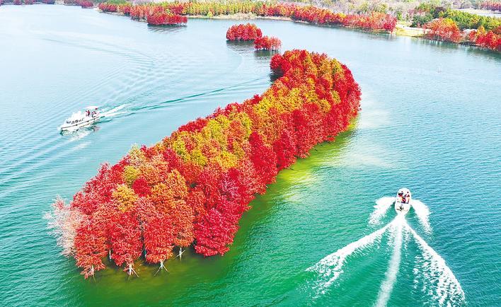 11月24日,游客在荆门漳河风景区游览。连日来,漳河风景区的红杉林已达到顶峰。深红色的枝叶、碧绿的漳河水和游船的白色波浪形成了美丽的对比,吸引了许多摄影爱好者和游客。 (世界网朱俊波供图)