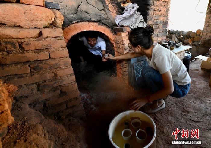 照片显示了Wu Zejiang和Ma Jinwen从Dragon Oven中取冷陶瓷。中国新闻社记者摄影摄影Wang Dongming的摄影